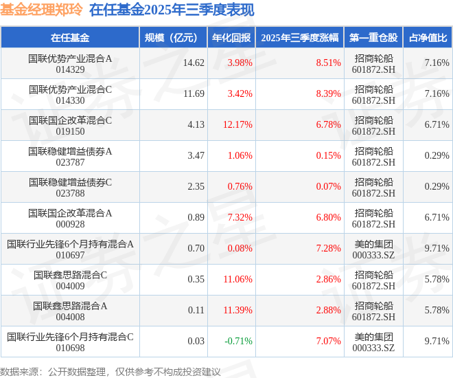 证券之星消息,截止2025年三季度末,基金经理郑玲旗下共管理10只基金,本季度表现最佳的为国联优势产业混合A(014329),季度净值涨8.51%。