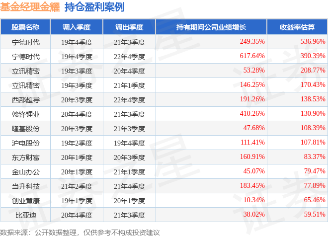 金耀管理的民生加银研究精选混合基金在19年4季度买入宁德时代,在持有1年又3个季度后在21年3季度卖出。持有期间的估算收益率为536.96%,持有期间宁德时代在2019年到2021年的年报归属净利润增幅达249.35%。