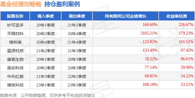 刘畅畅管理的华安文体健康混合A基金在20年1季度买入妙可蓝多,在持有1年又0个季度后在21年1季度卖出。持有期间的估算收益率为226.67%,持有期间妙可蓝多在2020年到2021年的年报归属净利润增幅达160.6%。