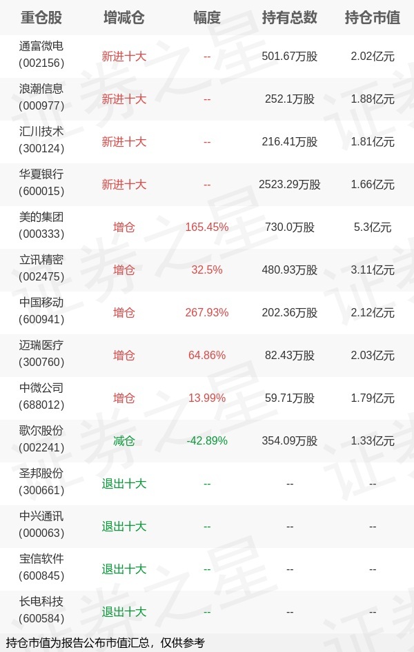 证券之星消息,10月28日兴业基金旗下周鸣 丁进管理的兴业收益增强债券型基金公布三季报,近1年净值增长率14.45%。与上一季度相比,该基金前十大重仓股新增通富微电,浪潮信息,汇川技术,华夏银行;并对美的集团增仓455.0万股,为该基金第一大重仓股;圣邦股份,中兴通讯,宝信软件,长电科技等退出前十大重仓股;详细数据如下: