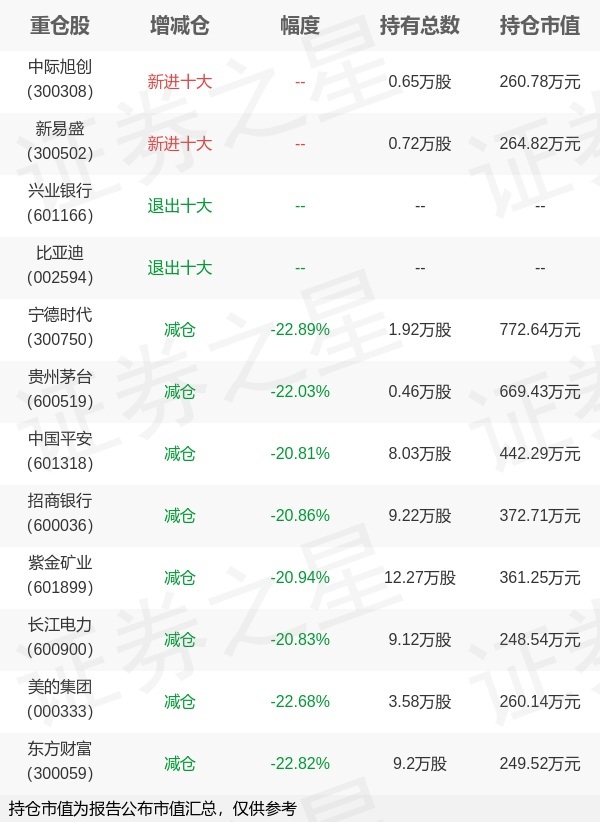 证券之星消息,10月28日天弘基金旗下陈瑶管理的天弘沪深300交易型开放式指数基金联接基金公布三季报,近1年净值增长率20.65%。与上一季度相比,该基金前十大重仓股新增中际旭创,新易盛;其中宁德时代持仓占比0.09%,为该基金第一大重仓股;兴业银行,比亚迪等退出前十大重仓股;详细数据如下: