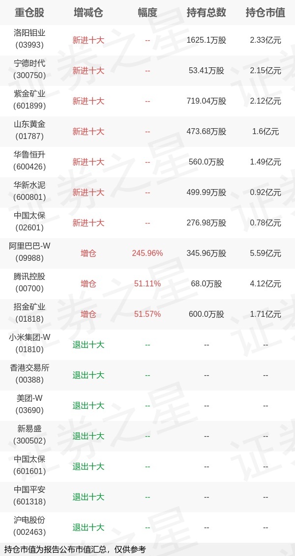 证券之星消息,10月28日中欧基金旗下华李成管理的中欧丰利债券型基金公布三季报,近1年净值增长率9.26%。与上一季度相比,该基金前十大重仓股新增洛阳钼业,宁德时代,紫金矿业,山东黄金,华鲁恒升,华新水泥,中国太保;并对阿里巴巴-W增仓245.96万股,为该基金第一大重仓股;小米集团-W,香港交易所,美团-W,新易盛,中国太保,中国平安,沪电股份等退出前十大重仓股;详细数据如下: