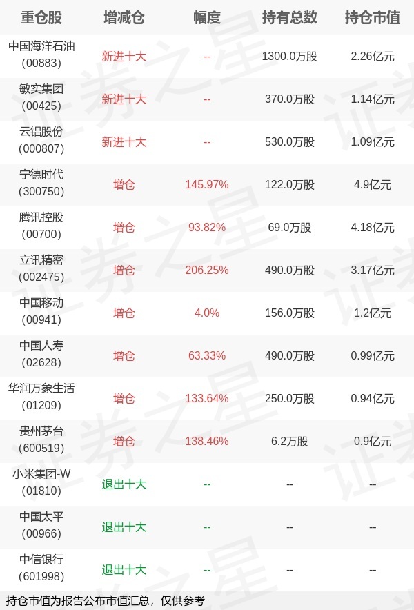 证券之星消息,10月28日睿远基金旗下侯振新管理的睿远稳益增强30天持有期债券型基金公布三季报,近1年净值增长率8.37%。与上一季度相比,该基金前十大重仓股新增中国海洋石油,敏实集团,云铝股份;并对宁德时代增仓72.4万股,为该基金第一大重仓股;小米集团-W,中国太平,中信银行等退出前十大重仓股;详细数据如下: