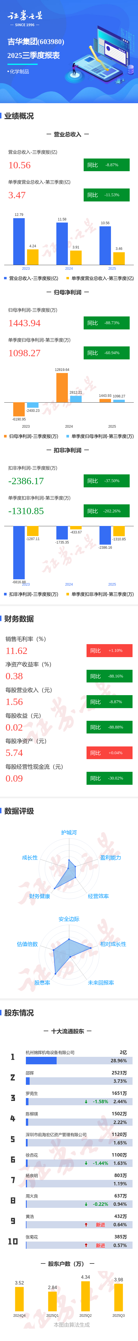 证券之星消息,吉华集团2025年三季报显示,公司主营收入10.56亿元,同比下降8.87%;归母净利润1443.94万元,同比下降88.74%;扣非净利润-2386.17万元,同比下降37.5%;其中2025年第三季度,公司单季度主营收入3.47亿元,同比下降11.53%;单季度归母净利润1098.27万元,同比下降60.95%;单季度扣非净利润-1310.85万元,同比下降202.26%;负债率13.18%,投资收益763.04万元,财务费用-2801.27万元,毛利率11.62%。