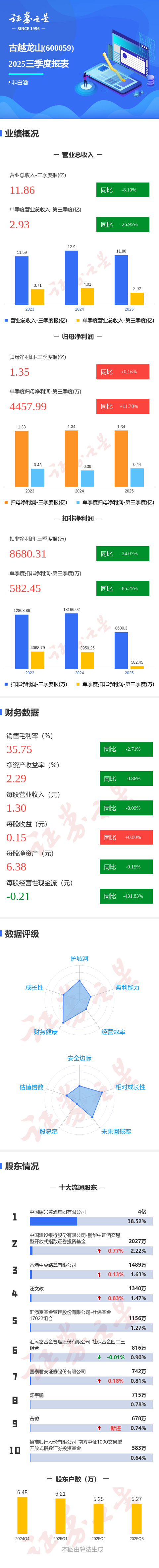 证券之星消息,古越龙山2025年三季报显示,公司主营收入11.86亿元,同比下降8.1%;归母净利润1.35亿元,同比上升0.17%;扣非净利润8680.31万元,同比下降34.07%;其中2025年第三季度,公司单季度主营收入2.93亿元,同比下降26.96%;单季度归母净利润4457.99万元,同比上升11.78%;单季度扣非净利润582.45万元,同比下降85.26%;负债率8.07%,投资收益102.51万元,财务费用-2696.63万元,毛利率35.75%。