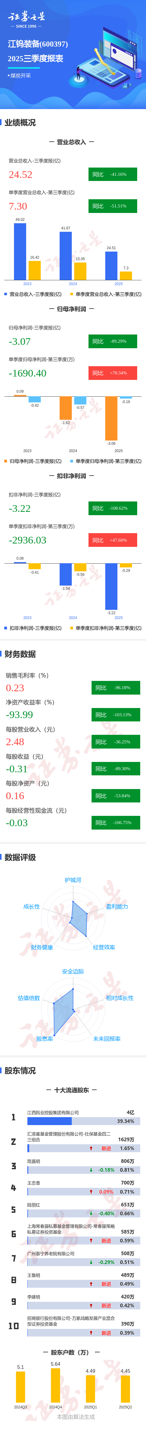 证券之星消息,江钨装备2025年三季报显示,公司主营收入24.52亿元,同比下降41.16%;归母净利润-3.07亿元,同比下降89.29%;扣非净利润-3.22亿元,同比下降108.62%;其中2025年第三季度,公司单季度主营收入7.3亿元,同比下降51.52%;单季度归母净利润-1690.4万元,同比上升70.35%;单季度扣非净利润-2936.03万元,同比上升47.61%;负债率55.98%,投资收益665.36万元,财务费用8955.68万元,毛利率0.23%。