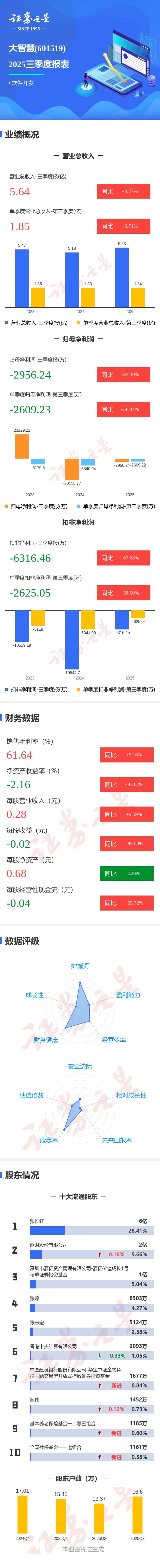 证券之星消息,大智慧2025年三季报显示,公司主营收入5.64亿元,同比上升8.78%;归母净利润-2956.24万元,同比上升85.3%;扣非净利润-6316.46万元,同比上升67.68%;其中2025年第三季度,公司单季度主营收入1.85亿元,同比上升0.72%;单季度归母净利润-2609.23万元,同比上升58.85%;单季度扣非净利润-2625.05万元,同比上升58.6%;负债率23.47%,投资收益3249.88万元,财务费用-1064.67万元,毛利率61.64%。