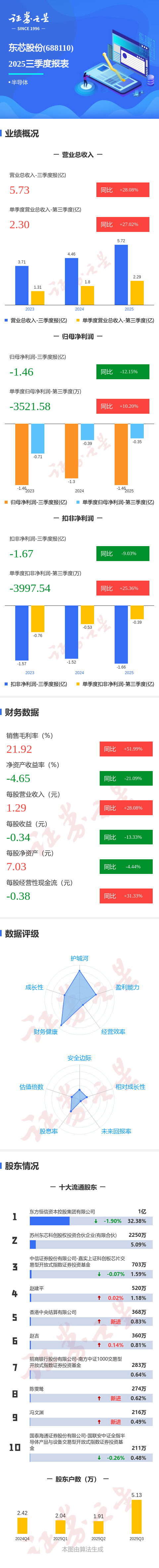 证券之星消息,东芯股份2025年三季报显示,公司主营收入5.73亿元,同比上升28.09%;归母净利润-1.46亿元,同比下降12.16%;扣非净利润-1.67亿元,同比下降9.03%;其中2025年第三季度,公司单季度主营收入2.3亿元,同比上升27.03%;单季度归母净利润-3521.58万元,同比上升10.21%;单季度扣非净利润-3997.54万元,同比上升25.37%;负债率5.21%,投资收益-5359.79万元,财务费用694.42万元,毛利率21.92%。