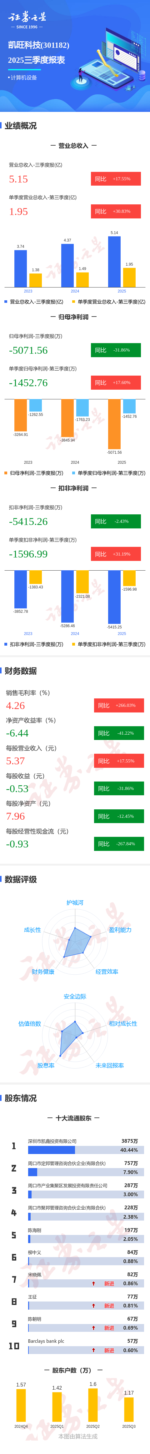 证券之星消息,凯旺科技2025年三季报显示,公司主营收入5.15亿元,同比上升17.55%;归母净利润-5071.56万元,同比下降31.87%;扣非净利润-5415.26万元,同比下降2.44%;其中2025年第三季度,公司单季度主营收入1.95亿元,同比上升30.83%;单季度归母净利润-1452.76万元,同比上升17.61%;单季度扣非净利润-1596.99万元,同比上升31.2%;负债率56.57%,投资收益66.05万元,财务费用666.97万元,毛利率4.26%。