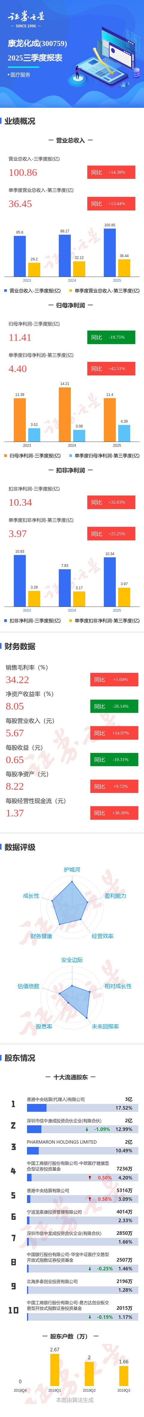 证券之星消息,康龙化成2025年三季报显示,公司主营收入100.86亿元,同比上升14.38%;归母净利润11.41亿元,同比下降19.76%;扣非净利润10.34亿元,同比上升32.04%;其中2025年第三季度,公司单季度主营收入36.45亿元,同比上升13.44%;单季度归母净利润4.4亿元,同比上升42.52%;单季度扣非净利润3.97亿元,同比上升25.25%;负债率41.16%,投资收益-3208.23万元,财务费用1.53亿元,毛利率34.22%。