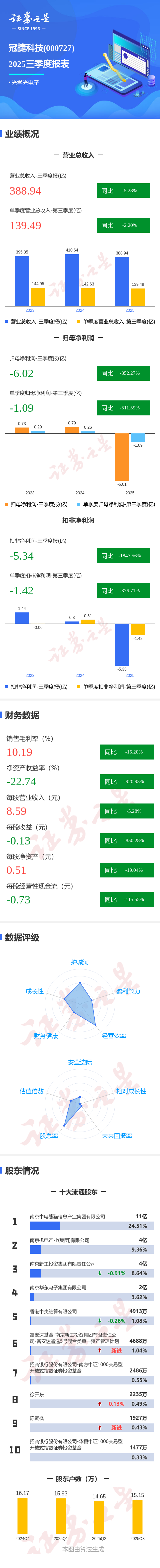证券之星消息,冠捷科技2025年三季报显示,公司主营收入388.94亿元,同比下降5.29%;归母净利润-6.02亿元,同比下降852.28%;扣非净利润-5.34亿元,同比下降1847.56%;其中2025年第三季度,公司单季度主营收入139.49亿元,同比下降2.2%;单季度归母净利润-1.09亿元,同比下降511.59%;单季度扣非净利润-1.42亿元,同比下降376.72%;负债率78.26%,投资收益-1.88亿元,财务费用2.11亿元,毛利率10.19%。