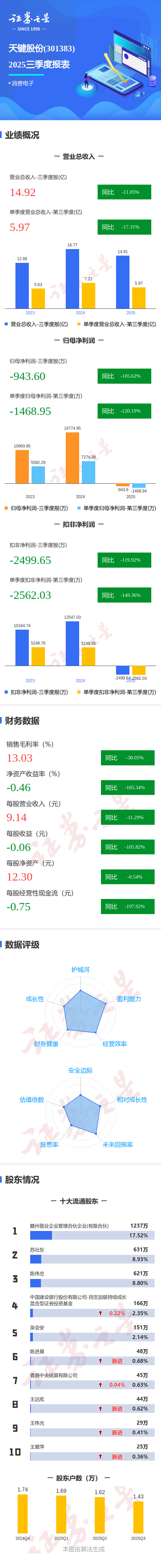 证券之星消息,天键股份2025年三季报显示,公司主营收入14.92亿元,同比下降11.05%;归母净利润-943.6万元,同比下降105.63%;扣非净利润-2499.65万元,同比下降119.92%;其中2025年第三季度,公司单季度主营收入5.97亿元,同比下降17.31%;单季度归母净利润-1468.95万元,同比下降120.19%;单季度扣非净利润-2562.03万元,同比下降149.37%;负债率25.14%,投资收益729.62万元,财务费用-808.39万元,毛利率13.03%。