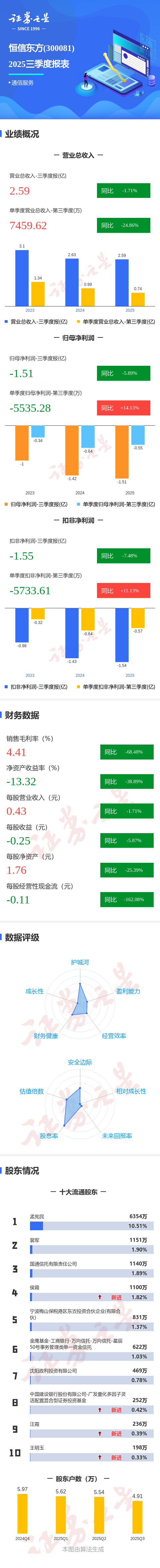 证券之星消息,恒信东方2025年三季报显示,公司主营收入2.59亿元,同比下降1.71%;归母净利润-1.51亿元,同比下降5.89%;扣非净利润-1.55亿元,同比下降7.48%;其中2025年第三季度,公司单季度主营收入7459.62万元,同比下降24.87%;单季度归母净利润-5535.28万元,同比上升14.14%;单季度扣非净利润-5733.61万元,同比上升11.13%;负债率54.45%,投资收益177.3万元,财务费用718.16万元,毛利率4.41%。