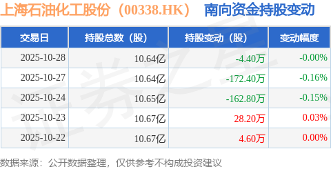 证券之星消息,10月28日南向资金减持4.4万股上海石油化工股份(00338.HK)。近5个交易日中,获南向资金减持的有3天,累计净减持306.8万股。近20个交易日中,获南向资金减持的有11天,累计净减持102.4万股。截至目前,南向资金持有上海石油化工股份(00338.HK)10.64亿股,占公司已发行普通股的33.08%。