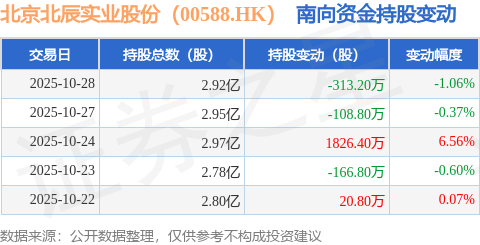 证券之星消息,10月28日南向资金减持313.2万股北京北辰实业股份(00588.HK)。近5个交易日中,获南向资金增持的有2天,累计净增持1258.4万股。近20个交易日中,获南向资金增持的有9天,累计净增持1116.6万股。截至目前,南向资金持有北京北辰实业股份(00588.HK)2.92亿股,占公司已发行普通股的41.33%。