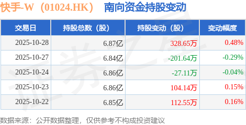 证券之星消息,10月28日南向资金增持328.65万股快手-W(01024.HK)。近5个交易日中,获南向资金增持的有3天,累计净增持316.59万股。近20个交易日中,获南向资金增持的有12天,累计净增持3450.42万股。截至目前,南向资金持有快手-W(01024.HK)6.87亿股,占公司已发行普通股的15.88%。