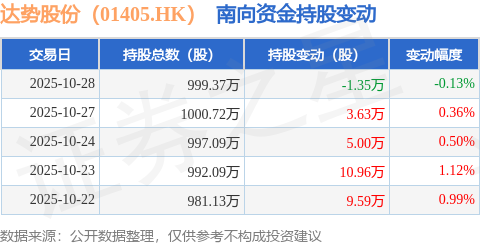 证券之星消息,10月28日南向资金减持1.35万股达势股份(01405.HK)。近5个交易日中,获南向资金增持的有4天,累计净增持27.83万股。近20个交易日中,获南向资金增持的有18天,累计净增持109.17万股。截至目前,南向资金持有达势股份(01405.HK)999.37万股,占公司已发行普通股的7.62%。