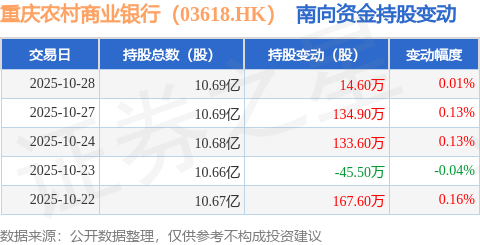 证券之星消息,10月28日南向资金增持14.6万股重庆农村商业银行(03618.HK)。近5个交易日中,获南向资金增持的有4天,累计净增持405.2万股。近20个交易日中,获南向资金增持的有18天,累计净增持8452.6万股。截至目前,南向资金持有重庆农村商业银行(03618.HK)10.69亿股,占公司已发行普通股的42.53%。