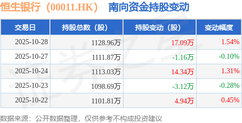 证券之星消息,10月28日南向资金增持17.09万股恒生银行(00011.HK)。近5个交易日中,获南向资金增持的有3天,累计净增持32.09万股。近20个交易日中,获南向资金减持的有5天,累计净减持31.82万股。截至目前,南向资金持有恒生银行(00011.HK)1128.96万股,占公司已发行普通股的0.59%。
