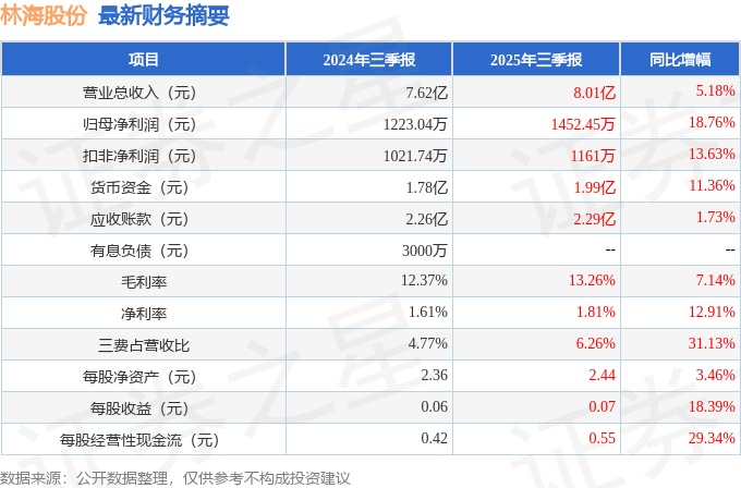 据证券之星公开数据整理,近期林海股份(600099)发布2025年三季报。截至本报告期末,公司营业总收入8.01亿元,同比上升5.18%,归母净利润1452.45万元,同比上升18.76%。按单季度数据看,第三季度营业总收入2.23亿元,同比下降32.09%,第三季度归母净利润287.2万元,同比下降21.72%。本报告期林海股份盈利能力上升,毛利率同比增幅0.12%,净利率同比增幅12.91%。