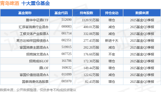 持有青岛啤酒最多的基金为鹏华中证酒ETF,目前规模为203.21亿元,最新净值0.5818(10月28日),较上一交易日上涨0.05%,近一年下跌7.26%。该基金现任基金经理为张羽翔。