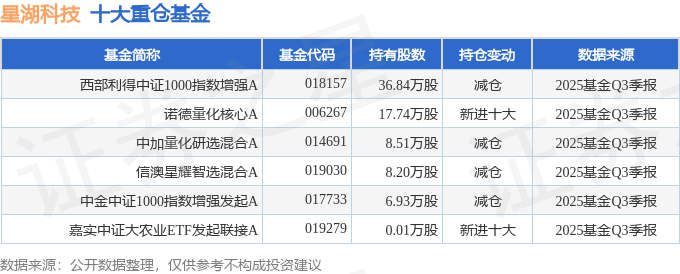 持有星湖科技最多的基金为西部利得中证1000指数增强A,目前规模为2.17亿元,最新净值1.3201(10月28日),较上一交易日下跌0.08%,近一年上涨34.44%。该基金现任基金经理为盛丰衍 翟梓舰。