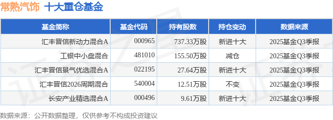 持有常熟汽饰最多的基金为汇丰晋信新动力混合A,目前规模为21.08亿元,最新净值2.0805(10月27日),较上一交易日上涨0.78%,近一年上涨28.44%。该基金现任基金经理为闵良超。