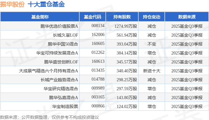 持有振华股份最多的基金为鹏华优选价值股票A,目前规模为20.63亿元,最新净值1.5707(10月27日),较上一交易日上涨0.66%,近一年上涨19.44%。该基金现任基金经理为伍旋。
