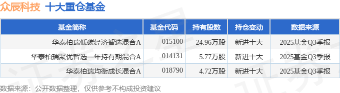 持有众辰科技最多的基金为华泰柏瑞低碳经济智选混合A,目前规模为2.49亿元,最新净值0.5964(10月28日),较上一交易日上涨0.13%,近一年上涨34.38%。该基金现任基金经理为赵楠。
