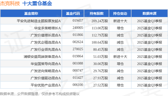 持有杰克科技最多的基金为平安先进制造主题股票发起A,目前规模为10.27亿元,最新净值1.9418(10月28日),较上一交易日下跌0.61%,近一年上涨99.1%。该基金现任基金经理为张荫先。