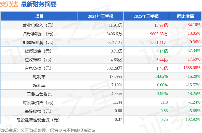 据证券之星公开数据整理,近期安乃达(603350)发布2025年三季报。截至本报告期末,公司营业总收入15.97亿元,同比上升34.1%,归母净利润9605.65万元,同比上升13.05%。按单季度数据看,第三季度营业总收入5.65亿元,同比上升27.81%,第三季度归母净利润2069.8万元,同比上升105.5%。本报告期安乃达公司应收账款体量较大,当期应收账款占最新年报归母净利润比达495.11%。