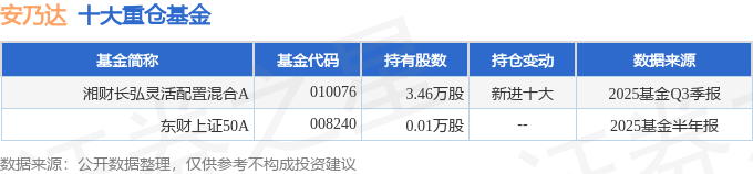 持有安乃达最多的基金为湘财长弘灵活配置混合A,目前规模为0.17亿元,最新净值0.9148(10月27日),较上一交易日上涨0.12%,近一年下跌1.87%。该基金现任基金经理为包佳敏。