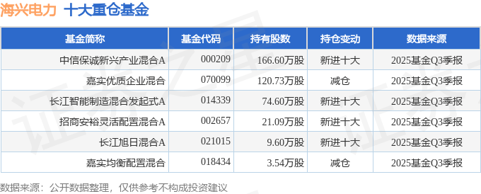 持有海兴电力最多的基金为中信保诚新兴产业混合A,目前规模为18.39亿元,最新净值2.7664(10月28日),较上一交易日上涨0.77%,近一年上涨22.94%。该基金现任基金经理为孙浩中。