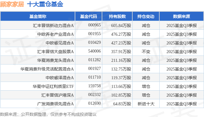 持有顾家家居最多的基金为汇丰晋信新动力混合A,目前规模为21.08亿元,最新净值2.0805(10月27日),较上一交易日上涨0.78%,近一年上涨28.44%。该基金现任基金经理为闵良超。