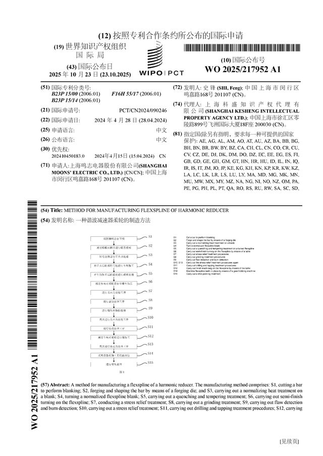 证券之星消息,根据企查查数据显示鸣志电器(603728)公布了一项国际专利申请,专利名为“一种谐波减速器柔轮的制造方法”,专利申请号为PCT/CN2024/090246,国际公布日为2025年10月23日。