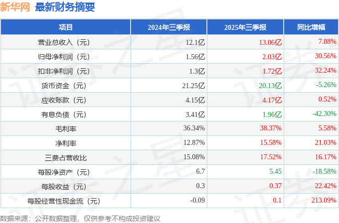 据证券之星公开数据整理,近期新华网(603888)发布2025年三季报。截至本报告期末,公司营业总收入13.06亿元,同比上升7.88%,归母净利润2.03亿元,同比上升30.56%。按单季度数据看,第三季度营业总收入4.95亿元,同比上升18.45%,第三季度归母净利润4938.02万元,同比上升31.71%。本报告期新华网盈利能力上升,毛利率同比增幅5.58%,净利率同比增幅21.03%。