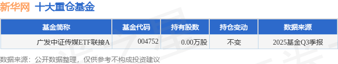 持有新华网最多的基金为广发中证传媒ETF联接A,目前规模为6.25亿元,最新净值0.9826(10月27日),较上一交易日下跌0.03%,近一年上涨27.74%。该基金现任基金经理为罗国庆。
