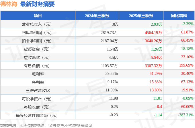 据证券之星公开数据整理,近期德林海(688069)发布2025年三季报。截至本报告期末,公司营业总收入2.93亿元,同比下降2.39%,归母净利润4564.19万元,同比上升61.87%。按单季度数据看,第三季度营业总收入1.85亿元,同比上升94.96%,第三季度归母净利润4873.47万元,同比上升1322.74%。本报告期德林海盈利能力上升,毛利率同比增幅30.4%,净利率同比增幅67.13%。