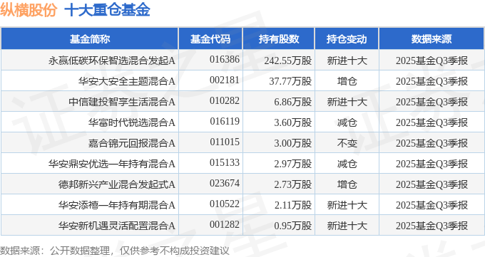 持有纵横股份最多的基金为永赢低碳环保智选混合发起A,目前规模为1.53亿元,最新净值0.8908(10月28日),较上一交易日下跌0.18%,近一年上涨0.46%。该基金现任基金经理为胡泽。