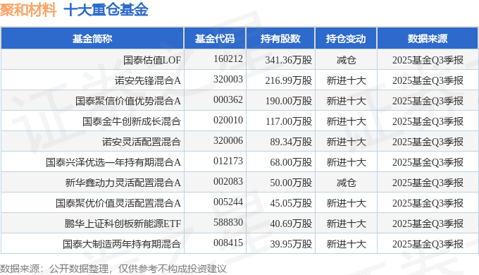 持有聚和材料最多的基金为国泰估值LOF,目前规模为15.66亿元,最新净值4.1304(10月28日),较上一交易日下跌0.07%,近一年上涨57.7%。该基金现任基金经理为王兆祥。