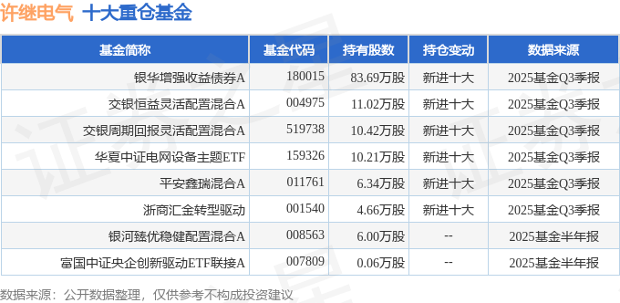 持有许继电气最多的基金为银华增强收益债券A,目前规模为22.27亿元,最新净值1.3247(10月28日),较上一交易日下跌0.08%,近一年上涨12.76%。该基金现任基金经理为贾鹏 冯帆。
