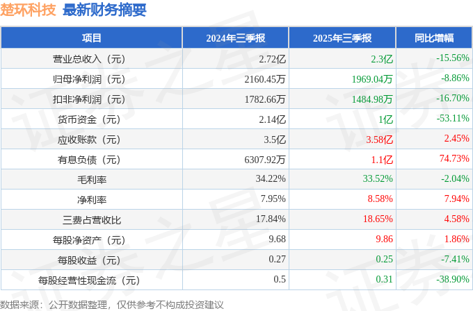 据证券之星公开数据整理,近期楚环科技(001336)发布2025年三季报。截至本报告期末,公司营业总收入2.3亿元,同比下降15.56%,归母净利润1969.04万元,同比下降8.86%。按单季度数据看,第三季度营业总收入1.13亿元,同比上升43.05%,第三季度归母净利润641.06万元,同比上升121.44%。本报告期楚环科技公司应收账款体量较大,当期应收账款占最新年报归母净利润比达1264.92%。