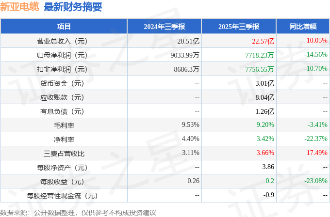 据证券之星公开数据整理,近期新亚电缆(001382)发布2025年三季报。截至本报告期末,公司营业总收入22.57亿元,同比上升10.05%,归母净利润7718.23万元,同比下降14.56%。按单季度数据看,第三季度营业总收入7.4亿元,同比下降15.43%,第三季度归母净利润2213.63万元,同比下降36.86%。本报告期新亚电缆公司应收账款体量较大,当期应收账款占最新年报归母净利润比达596.42%。