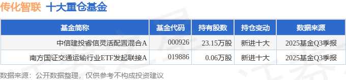 持有传化智联最多的基金为中信建投睿信灵活配置混合A,目前规模为0.31亿元,最新净值0.7601(10月28日),较上一交易日下跌0.26%,近一年上涨20.32%。该基金现任基金经理为杨志武 艾翀。