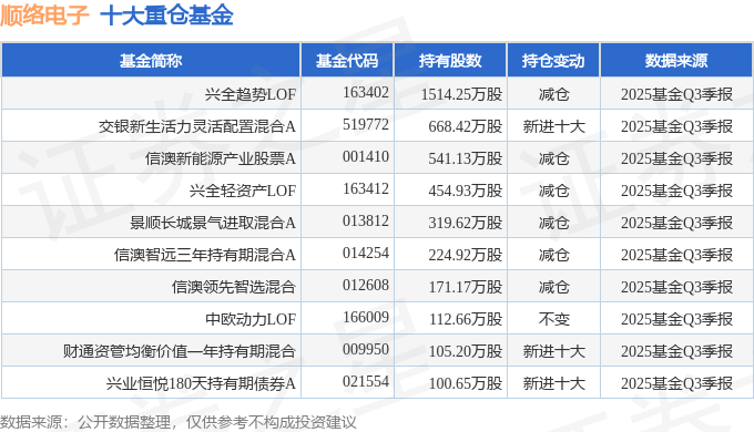 持有顺络电子最多的基金为兴全趋势LOF,目前规模为151.39亿元,最新净值0.7153(10月28日),较上一交易日下跌1.12%,近一年上涨18.38%。该基金现任基金经理为杨世进 谢长雁。