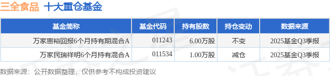 持有三全食品最多的基金为万家惠裕回报6个月持有期混合A,目前规模为0.65亿元,最新净值1.1399(10月27日),较上一交易日上涨0.35%,近一年上涨10.15%。该基金现任基金经理为陈佳昀。