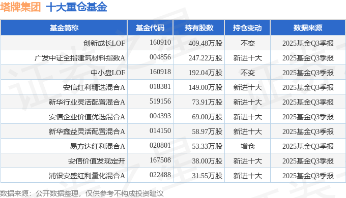 持有塔牌集团最多的基金为创新成长LOF,目前规模为9.37亿元,最新净值0.99(10月28日),较上一交易日下跌0.5%,近一年上涨9.78%。该基金现任基金经理为侯春燕。