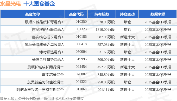 持有水晶光电最多的基金为景顺长城品质长青混合A,目前规模为71.1亿元,最新净值1.8182(10月27日),较上一交易日上涨2.15%,近一年上涨86.04%。该基金现任基金经理为农冰立。
