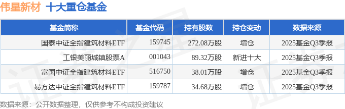 持有伟星新材最多的基金为国泰中证全指建筑材料ETF,目前规模为11.02亿元,最新净值0.6504(10月28日),较上一交易日下跌1.0%,近一年上涨7.92%。该基金现任基金经理为黄岳。