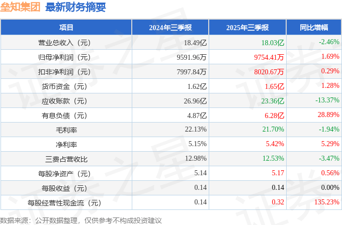 据证券之星公开数据整理,近期垒知集团(002398)发布2025年三季报。截至本报告期末,公司营业总收入18.03亿元,同比下降2.46%,归母净利润9754.41万元,同比上升1.69%。按单季度数据看,第三季度营业总收入6.09亿元,同比下降9.15%,第三季度归母净利润3173.14万元,同比上升34.79%。本报告期垒知集团公司应收账款体量较大,当期应收账款占最新年报归母净利润比达4741.68%。